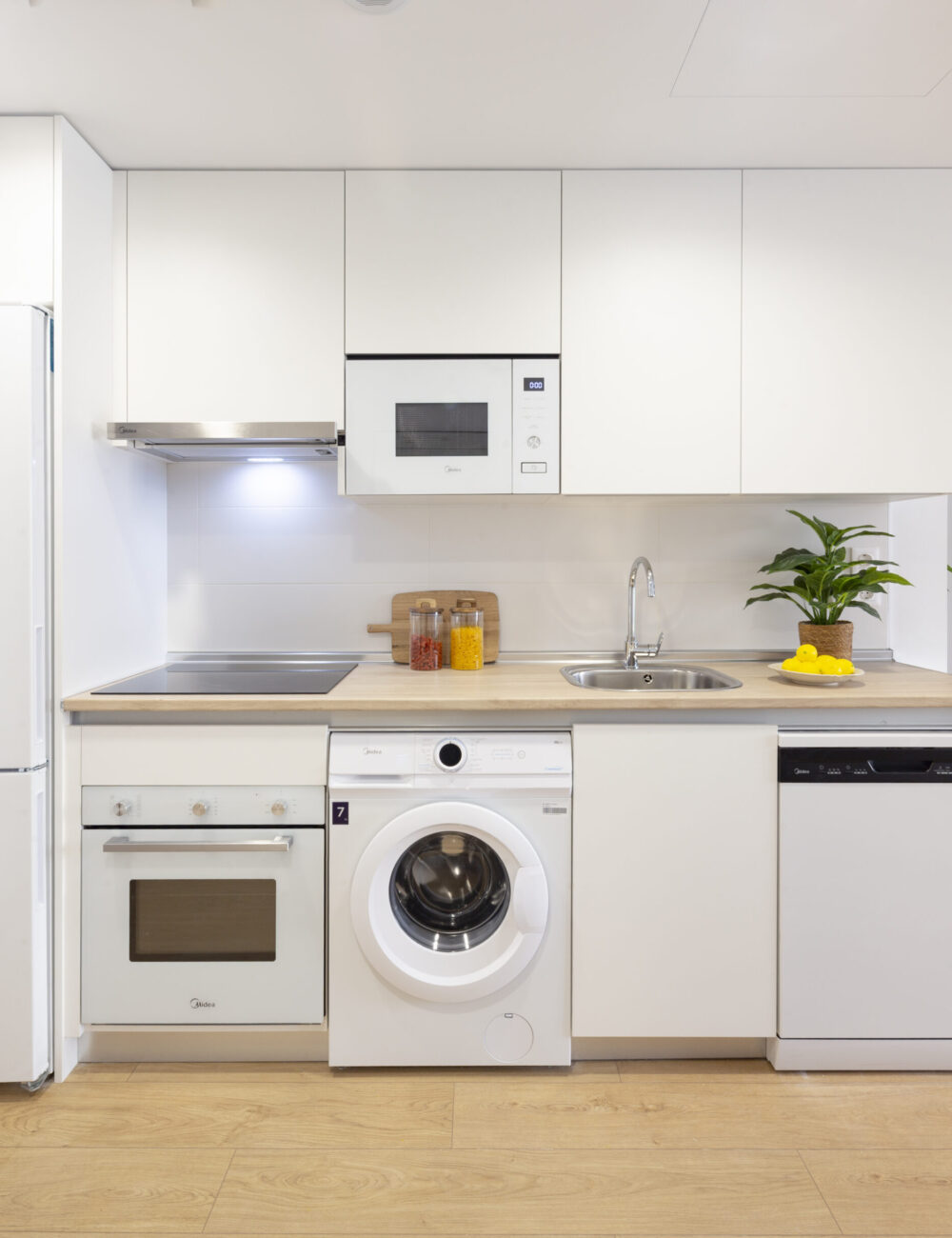 Cocina con muebles y electrodomésticos, resto de vivienda no amueblada.
